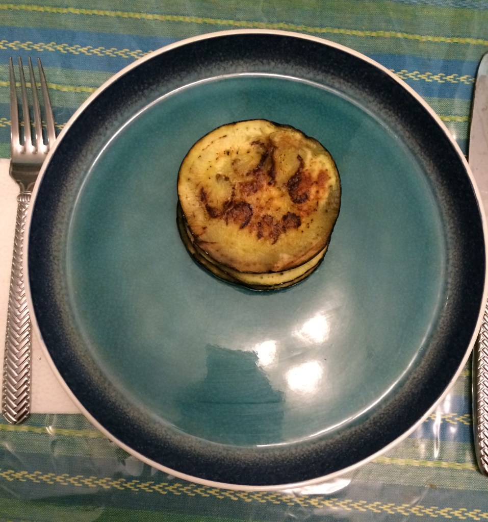 I used the grill pan on the fifth burner to grill the eggplant coins for about 7 to 9 minutes or so. I didn’t keep track of the time. I viewed the coins to see when they were golden brown. I turned each coin over halfway through.