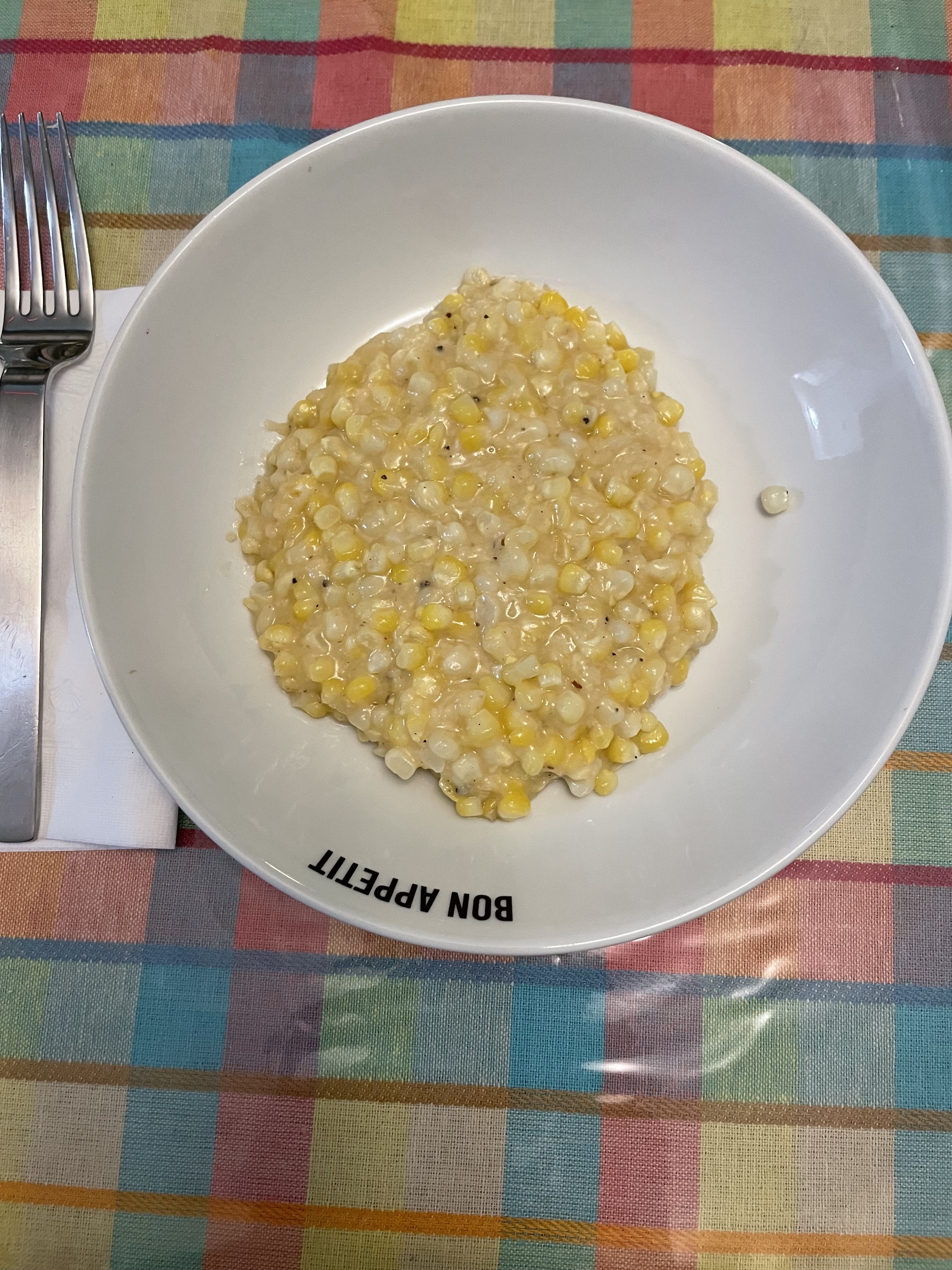 The upside-down pasta bowl proclaims Bon Appetit. The recipe for the alfredo corn in the photo comes from Bon Appetit magazine. It’s creamed corn circa 2024. Better than the store-bought kind which likely has a chemical additive via natural flavor as an ingredient.